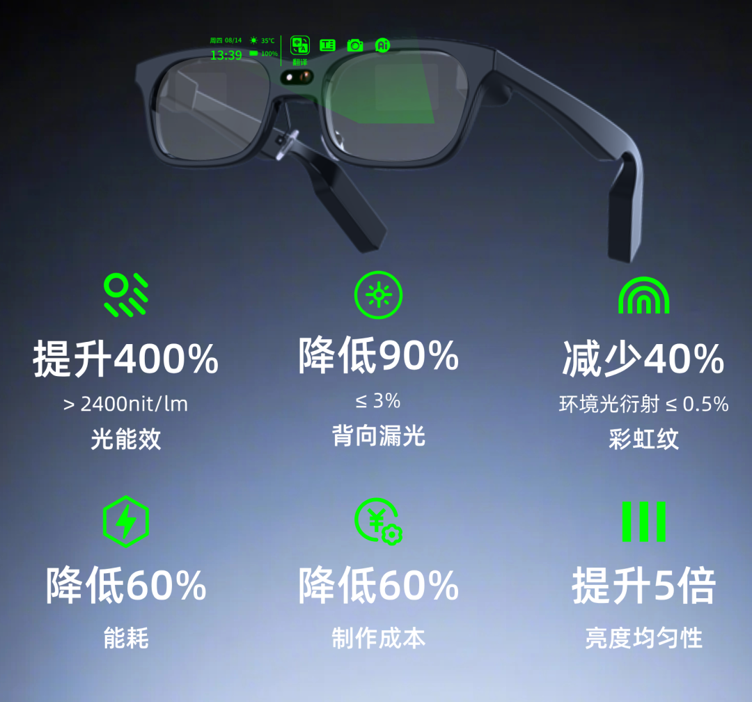為戶外場景量身打造,追求極致亮度與續(xù)航表現(xiàn)。立訊精密和東南大學(xué)、南京平行視界技術(shù)有限公司聯(lián)合推出的PVG單綠AR眼鏡,展現(xiàn)了在光學(xué)技術(shù)上的一種極致探索。