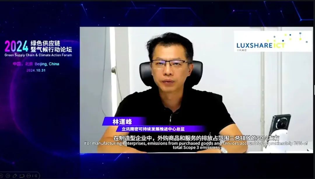 在綠色供應(yīng)鏈暨氣候行動(dòng)論壇活動(dòng)期間,立訊精密可持續(xù)發(fā)展推進(jìn)中心總監(jiān)林道鋒分享了立訊精密在綠色供應(yīng)鏈管理方面的良好實(shí)踐,助力各行各業(yè)企業(yè)落實(shí)供應(yīng)鏈環(huán)境和氣候承諾。