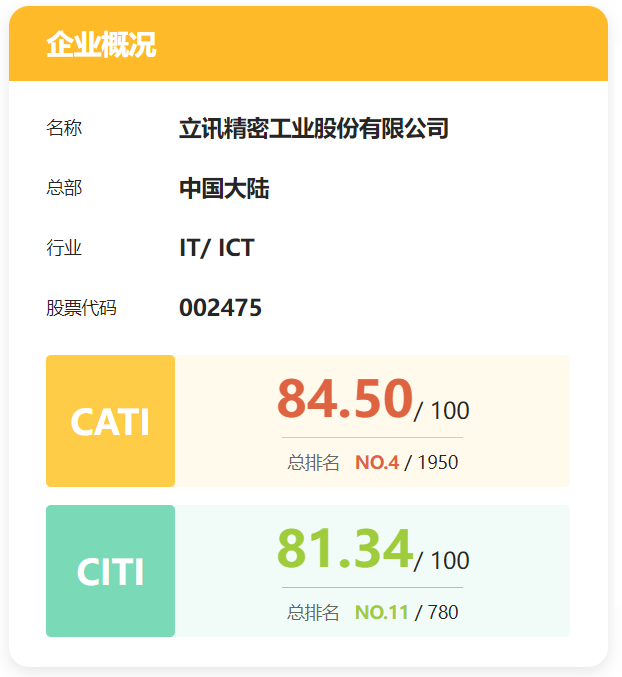 2024年10月31日,公眾環(huán)境研究中心(IPE)在北京發(fā)布綠色供應(yīng)鏈CITI指數(shù)和供應(yīng)鏈氣候行動(dòng)CATI指數(shù)2024年度報(bào)告,本期評(píng)價(jià)覆蓋23個(gè)行業(yè)的780家中外企業(yè)。立訊精密供應(yīng)鏈氣候行動(dòng)CATI指數(shù)位列全行業(yè)第四名,綠色供應(yīng)鏈CITI指數(shù)位列全行業(yè)第十一名,整體表現(xiàn)連續(xù)多年領(lǐng)跑大中華區(qū)。