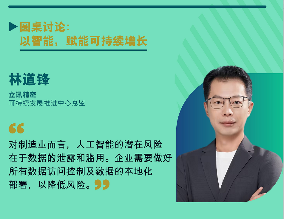 作為上榜2024年《財富》中國ESG影響力榜的企業(yè)嘉賓,立訊精密可持續(xù)發(fā)展推進中心林道鋒總監(jiān)受邀出席并參與論壇重要環(huán)節(jié)“以智能,賦能可持續(xù)增長”為主題的圓桌討論,與其他嘉賓共同探討通過前沿策略分析和優(yōu)秀案例分享,推動ESG成為價值創(chuàng)造的新引擎。林總監(jiān)在討論中不僅分享了公司在智能技術(shù)應(yīng)用方面IOE智慧能源管理平臺建設(shè)的進展,還深入探討了在人工智能時代中如何強化隱私保護及數(shù)據(jù)安全,助力企業(yè)ESG實現(xiàn)更高質(zhì)量的增長。