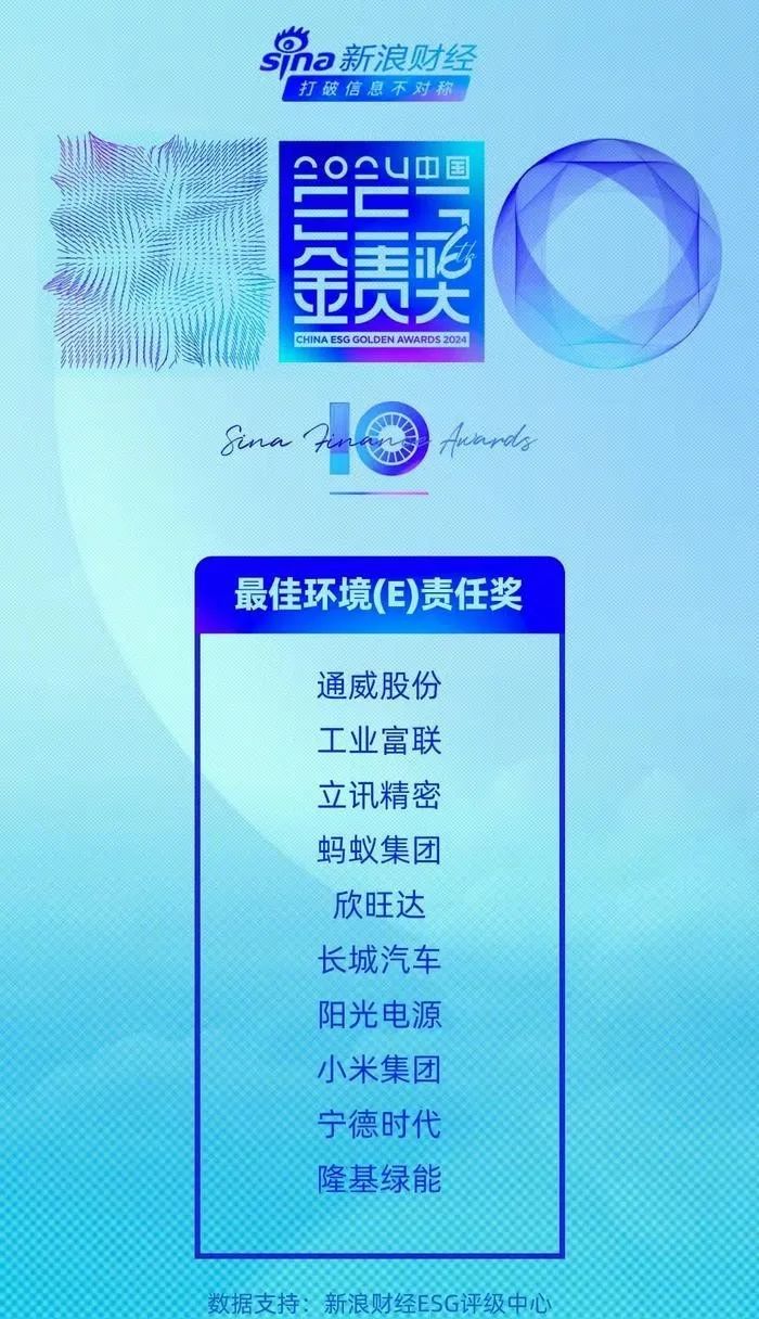 1月16日,由新浪財經(jīng)主辦的2024企業(yè)ESG“金責獎”評選結(jié)果正式公布。經(jīng)ESG權(quán)威評級數(shù)據(jù)庫評分、公眾投票及專家評審委員會嚴格審核,立訊精密榮獲2024企業(yè)ESG“金責獎”——最佳環(huán)境(E)責任獎。