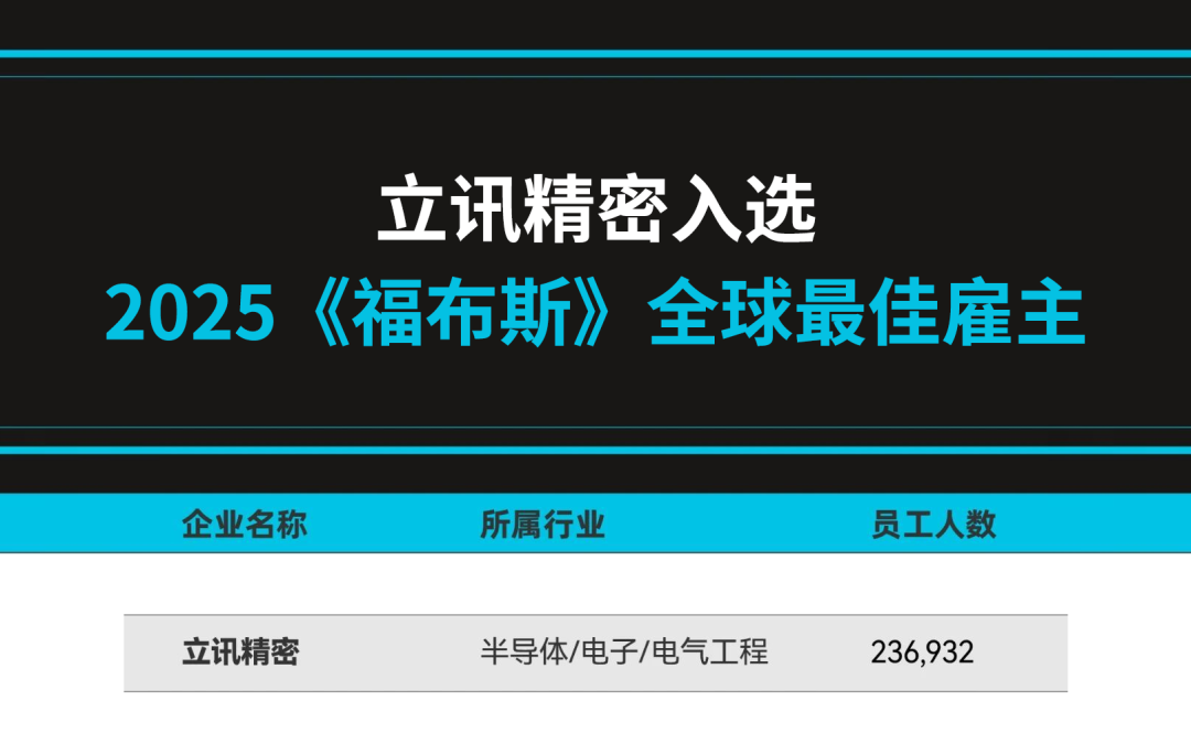近日,全球權(quán)威財經(jīng)媒體《福布斯》正式發(fā)布 2025 年全球最佳雇主榜單,立訊精密成功入選。
